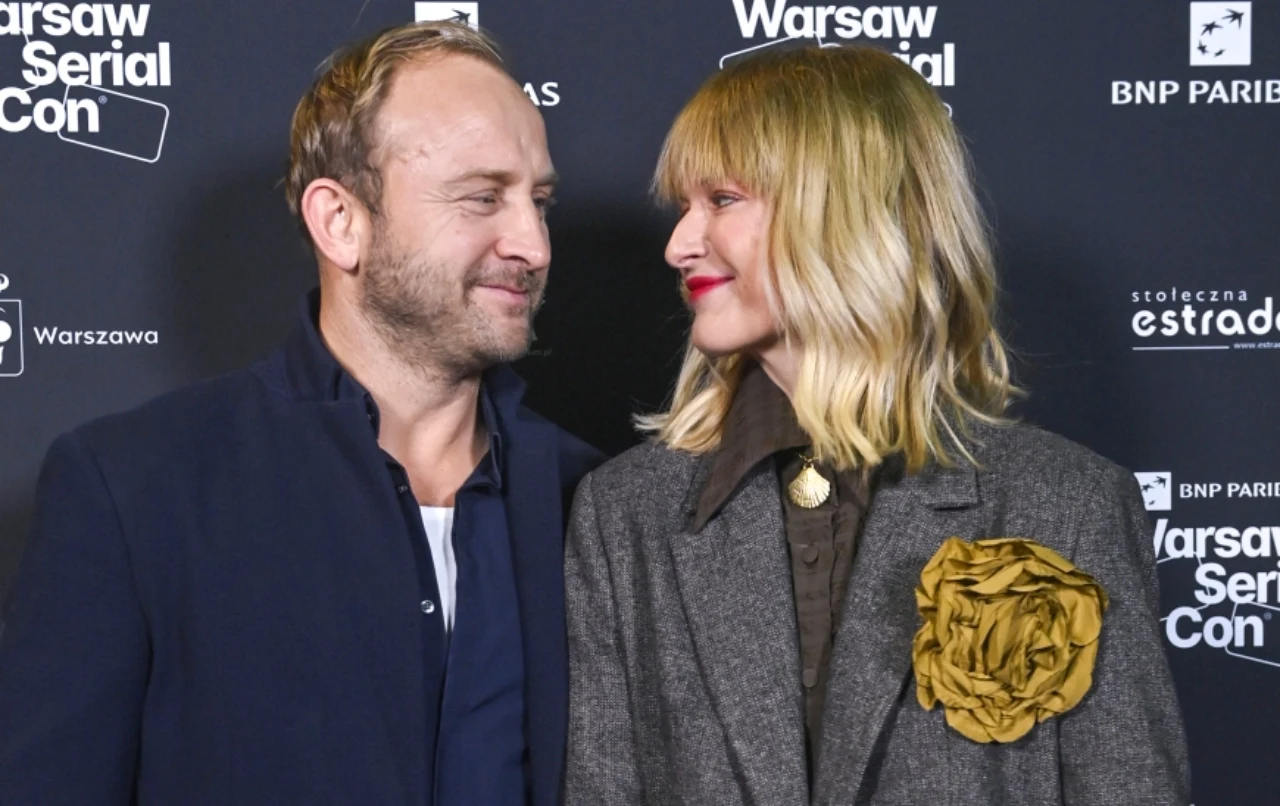 Aktorowi podczas imprezy towarzyszyła żona Justyna. Dziennikarka i autorka podcastów postawiła tego wieczoru na efektowną stylizację. Justyna wystąpiła w komplecie - koszuli i spodniach w kolorze umbry. Zestaw uszyty z tkaniny o ciekawej fakturze wyróżniały falbany - obecne zarówno przy rękawach, jak i nogawkach spodni. Ten ciekawy komplet z kolekcji marki Pola N. dziennikarka zestawiła z szaro-brązową, oversize'ową marynarką.