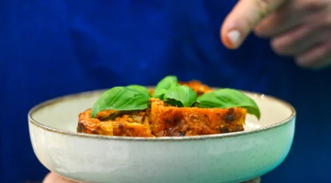 Materiał promocyjnyMakaron Spaghetti z piersią z kurczaka w sosie gorgonzola ze świeżą bazylią i orzechową nutą
