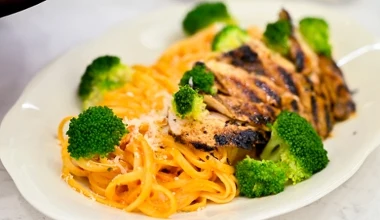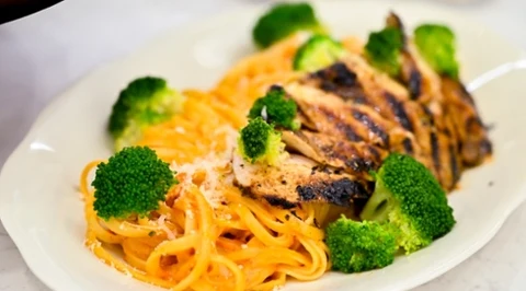 halo tu kuchnia Brudzące białe bluzki spaghetti - krem z pieczonych pomidorów, ricotty i bazylii z grillowanym kurczakiem i brokułami