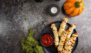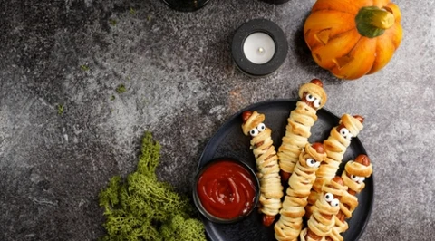 halo tu kuchnia Przekąski z ciasta francuskiego na Halloween – pizzerinki z pająkiem i parówki-mumie, krok po kroku