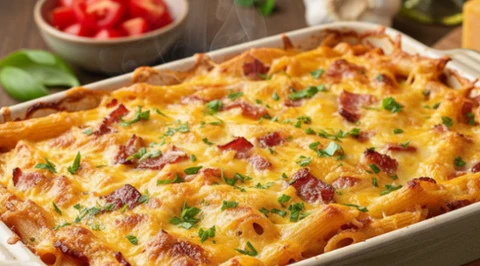 halo tu kuchnia Podwójnie serowe penne – z boczkiem i pomidorami. Zapiekanka makaronowa według Mateusza Gesslera