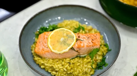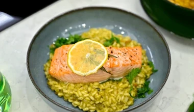 halo tu kuchnia Zielone risotto z pesto i pieczonym łososiem - sprytny sposób na warzywa dla najmłodszych
