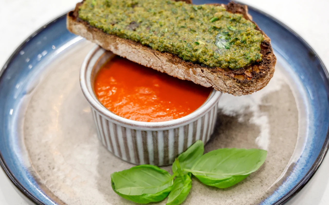 Krem pomidorowy na maśle z pesto pietruszkowym na grzance według Jurka Sobieniaka