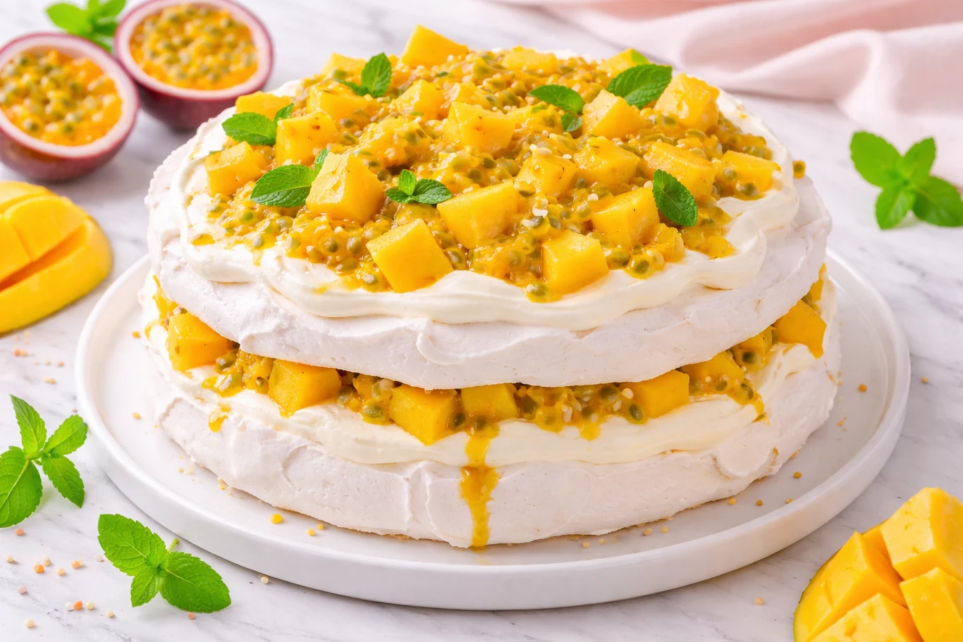 Całość dopełniają owoce, które nadają deserowi świeżości i lekkiej kwasowości. Mango wnosi naturalną słodycz i miękkość, a marakuja przełamuje ją intensywnym, tropikalnym akcentem. Dzięki temu każdy kęs jest ciekawy i nieprzesłodzony. To właśnie ten kontrast sprawia, że tort nie tylko pięknie wygląda, ale też znika z talerzy szybciej, niż zdążysz się obejrzeć.