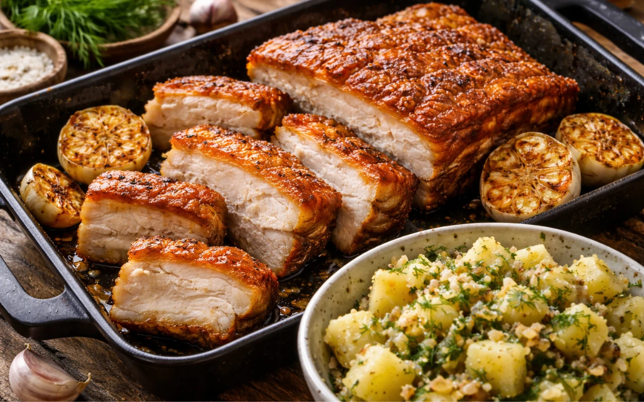 Długo pieczony boczek z chrupiącą skórą i aromatycznym, pieczonym czosnkiem to klasyczne danie, które łączy intensywny smak mięsa z delikatnością ziemniaków i świeżego koperku. Idealnie sprawdzi się na większe spotkanie przy stole.