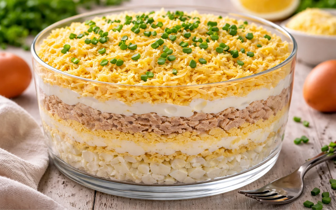 To jedna z tych sałatek, które zawsze się udają i nie wymagają dużych umiejętności kulinarnych. Przygotujesz ją w około 20 minut, a potrzebujesz do tego zaledwie kilku podstawowych składników, które większość z nas ma w lodówce - jajek, puszki tuńczyka, sera i majonezu. Całość układa się warstwami, dzięki czemu sałatka prezentuje się bardzo efektownie na stole.