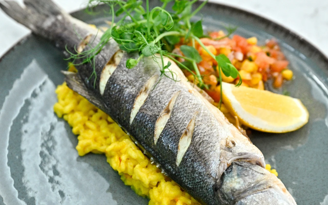 Idealnie soczysty i aromatyczny obiad. Pieczony okoń morski z tymiankiem i czosnkiem, salsa i szafranowe risottto