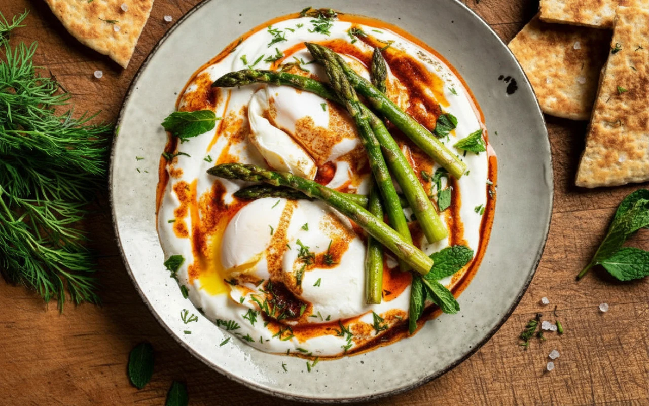Na talerz wyłóż porcję jogurtu czosnkowego, ułóż na nim szparagi, a na środku położ jajka w koszulce. Polej gorącym masłem chili i udekoruj sałatką ziołową.