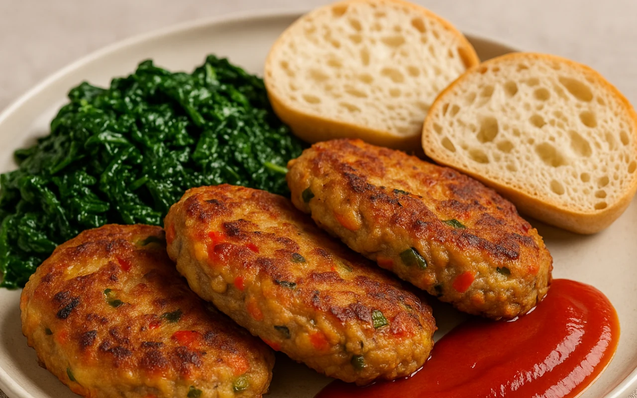 Kotlety wieprzowo-ziemniaczane – ze szpinakiem i ciabattą podane. Propozycja Jurka Sobieniaka