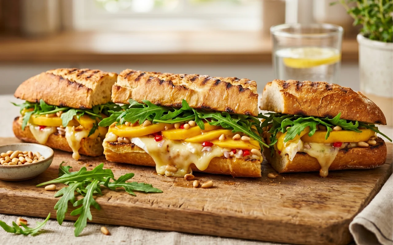 Grillowana bagietka z serem brie, mango i orzeszkami piniowymi
