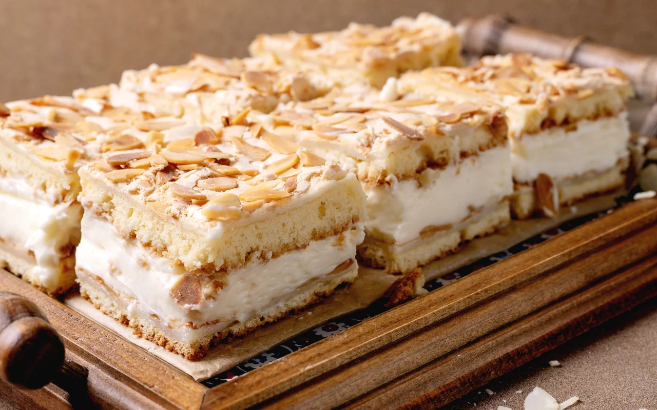 Schłodzony krem połączyć z ubitą śmietanką, tworząc lekką masę. Biszkopt przekroić wzdłuż na dwie części (by uzyskać dwa mniejsze prostokąty). Na dolnej warstwie rozprowadzić krem, przykryć drugą, bezową częścią, tak by prażone migdały znalazły się na wierzchu. Odstawić do lodówki na kilka godzin, najlepiej na całą noc.