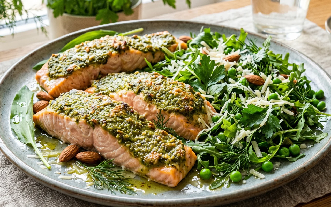 Pieczony łosoś z pesto z czosnku niedźwiedziego i ziołową sałatką