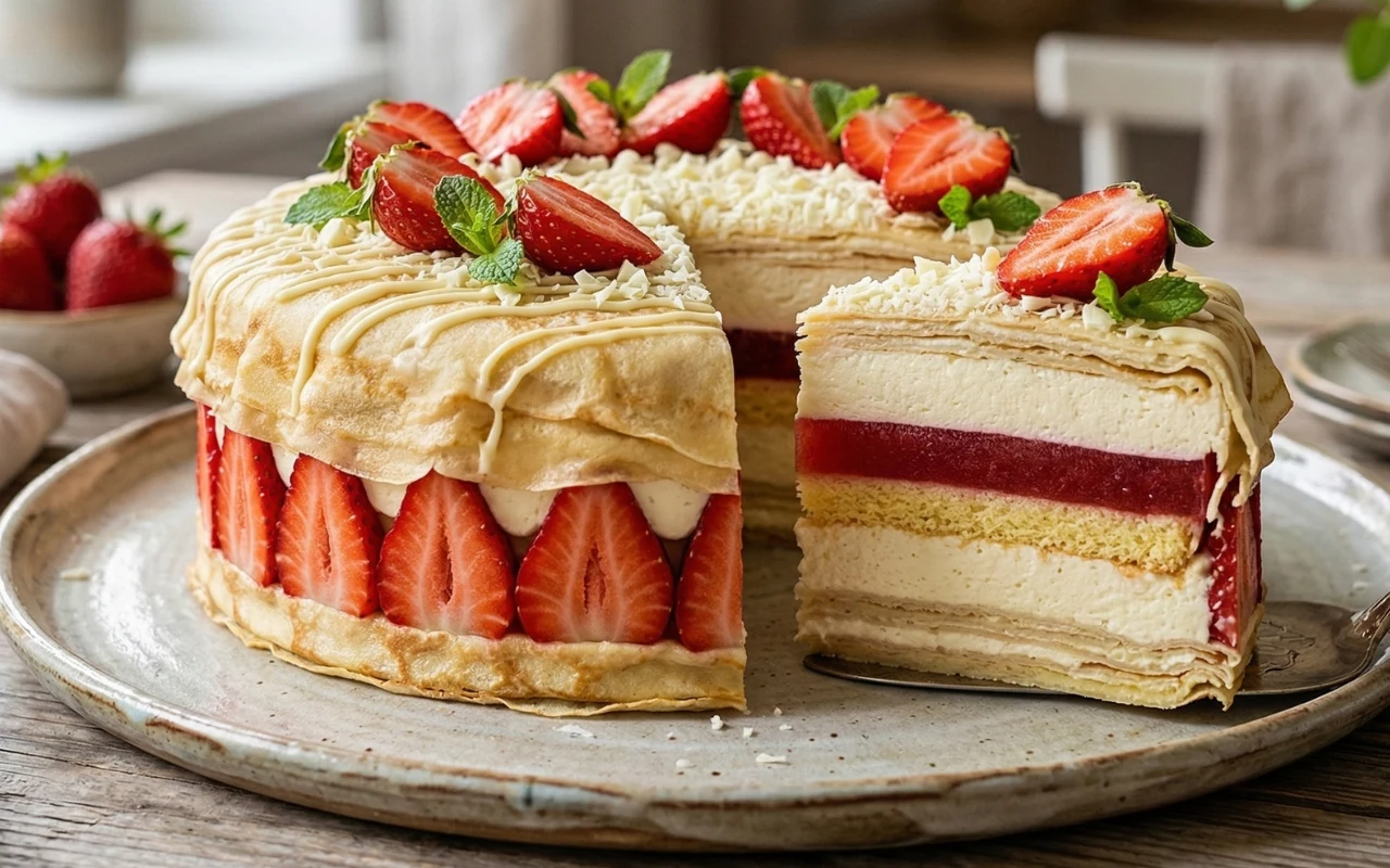Tort naleśnikowy z galaretką truskawkową i białoczekoladowym musem