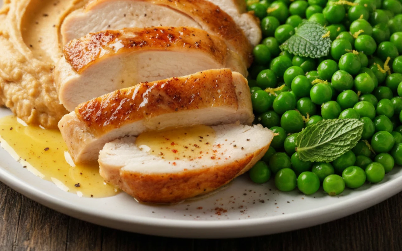 Pieczony kurczak z orzechowym purée i miętowym groszkiem
