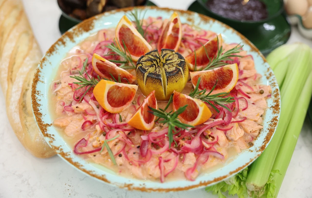 To propozycja dla wszystkich, którzy w świątecznym repertuarze rybnym szukają czegoś lżejszego i bardziej współczesnego niż karp czy śledź. Jurek Sobieniak sięga po łososia i pozwala, by to cytrusy przejęły rolę głównego nośnika smaku, nadając całości świeżyego, a jednocześnie wyraźnego charakteru. Danie to, choć inspirowane różnymi tradycjami, podporządkowane jest prostocie, szybkości i wyraźnemu kontrastowi wobec klasycznych ryb.