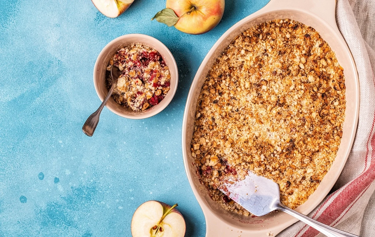 Ten przepis to kwintesencja domowego komfortu z nutą wykwintności. Pod słodką, chrupiącą kruszonką skrywają się miękkie jabłka i wiśnie doprawione wanilią oraz miodem spadziowym. Całość dopełnia aksamitny sorbet z truskawek i cydru, który wnosi lekkość i świeżość. Mateusz Gessler proponuje to danie jako idealne zwieńczenie kolacji — dla gości, rodziny, albo po prostu... dla siebie. Smakuje najlepiej na ciepło, z zimnym sorbetem na wierzchu.