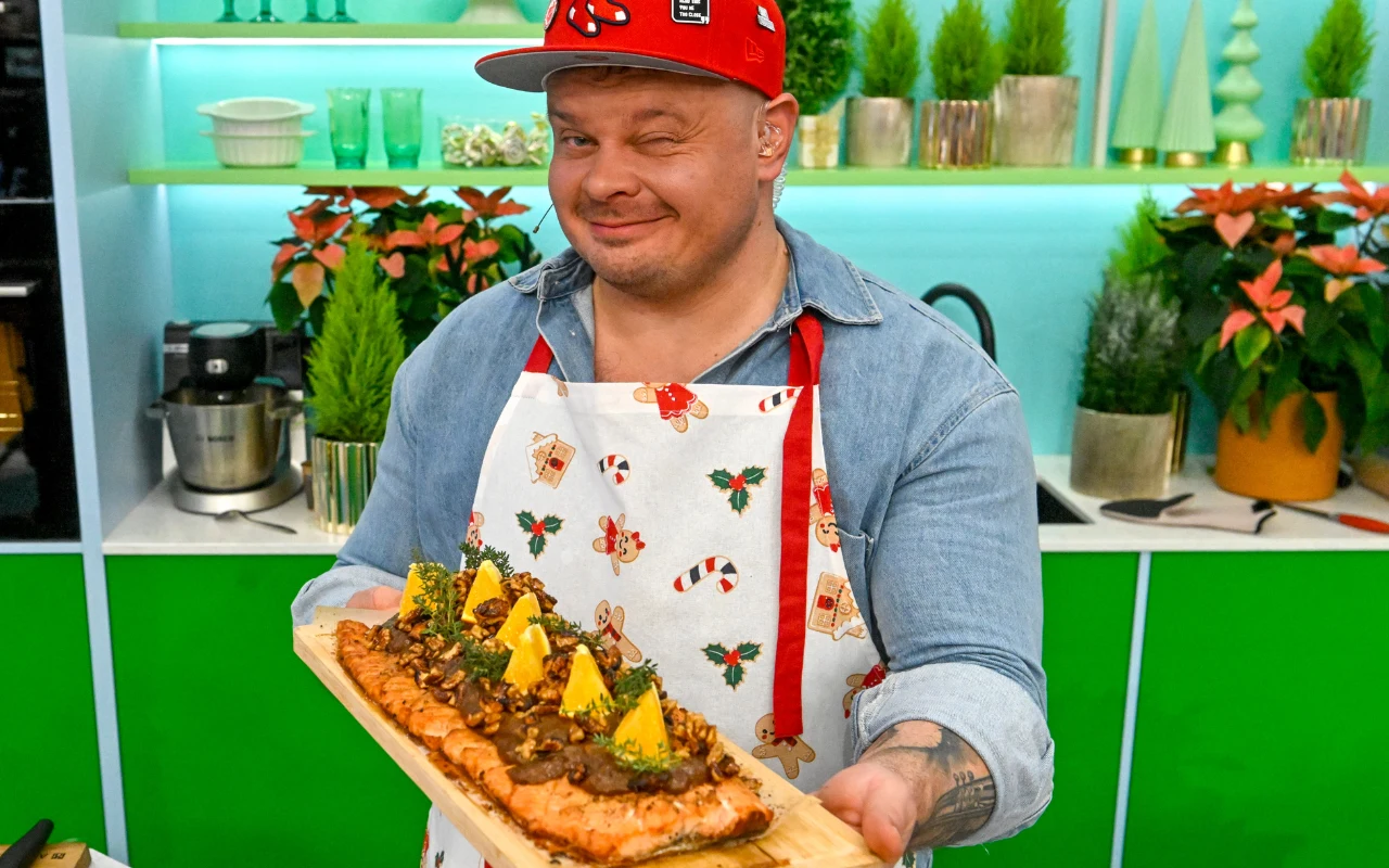Dziś w kuchni "halo tu polsat" Jurek Sobieniak proponuje przełamanie tradycyjnego smaku łososia. Nową, ciekawą kompozycję szef uzyskuje, podając upieczoną rybę w towarzystwie daktyli i masła orzechowego oraz karmelizowanych orzechów włoskich. Słodycz zostaje zrównoważona aromatem i mocą młotkowanego pieprzu, którego wyczuwalna tekstura i zdecydowany akord smakowy znakomicie pasują do delikatnej ryby i aromatycznych orzechów.