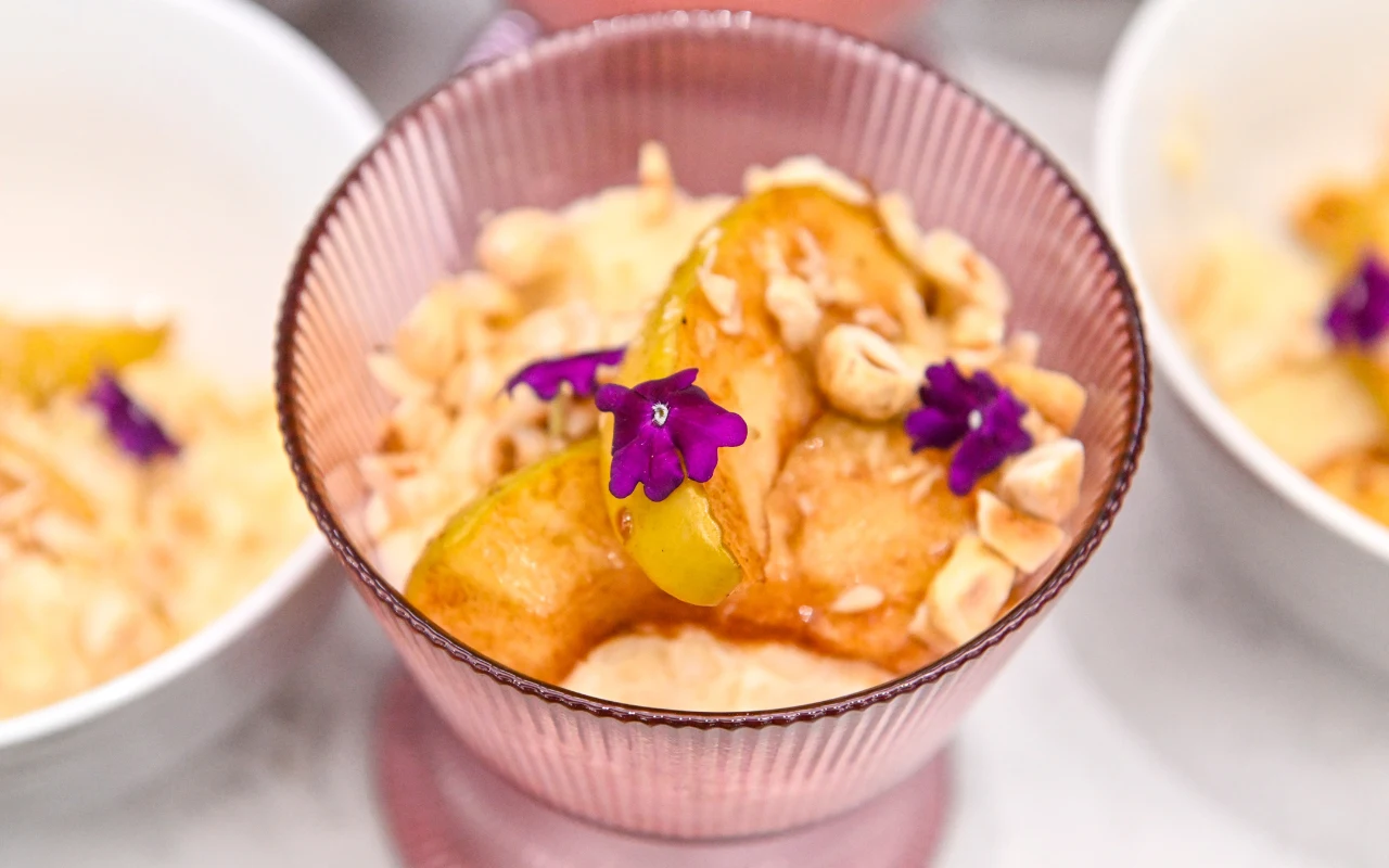 Pudding ryżowy uchodzi dziś za coś między oldschoolowym deserem a wspomnieniem dzieciństwa – niewielu wie jednak, że danie to może pochwalić się historią liczącą tysiące lat, a zasięg terytorialny tejże równa się zaś temu, który charakteryzuje sam ryż. I tak w Indiach – jako kheer – znany był już w czasach wedyjskich, podawano go zaś z mlekiem, kardamonem i pistacjami. W Iranie przybierał formę szafranowego sholezard, serwowanego na ogół z wodą różaną i cukrem pudrem. W Ameryce Łacińskiej, jako arroz con leche, pachniał wanilią, rumem, cynamonem, a czasem również cytrusami i goździkami. W Skandynawii do dziś trafia na świąteczne stoły jako risengrød. W Anglii z kolei od czasów Tudorów pieczono go w formie whitepotu – mlecznej zapiekanki z chlebem, ryżem i gałką muszkatołową. Wersja Ewy Wachowicz świadomie miesza te wpływy – są i przyprawy, i cytrusy, i aż trzy rodzaje mleka – jak w tres leches, choć z zupełnie innym efektem. Całość zamyka pieczone jabłko – zwrot akcji w globalnej mleczno-ryżowej historii.