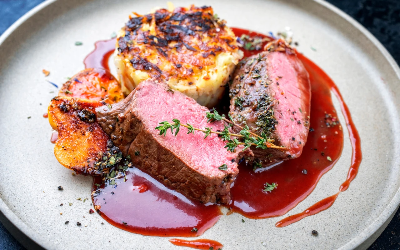Polędwiczka na selerowym purée – z aksamitnym sosem pieprzowo-truskawkowym. Przepis Ewy Olejniczak
