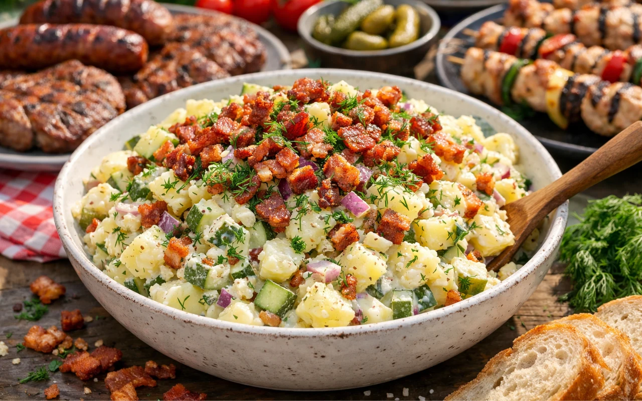 Sałatka ziemniaczana z sosem majonezowo-jogurtowym, ogórkami, koperkiem i cebulą to idealne połączenie smaków, które doskonale komponują się z potrawami z grilla. Jej lekka kwasowość (dzięki ogórkom i musztardzie) znakomicie przełamuje tłustość mięsa, a świeży koperek wnosi wiosenny aromat i odrobinę świeżości.