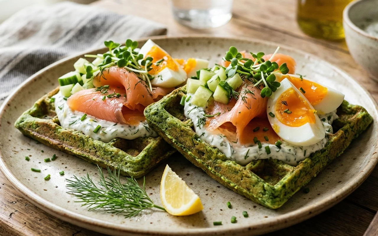 Poranny fenomen na zielono. Wytrawne gofry ze szpinakiem i łososiem według Karoliny Stolarskiej-Bigos