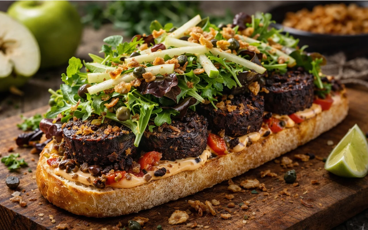 Kaszanka, często kojarzona z tradycyjną kuchnią, w tym przepisie zyskuje nowoczesną formę. Obsmażona na maśle klarowanym nabiera złocistej skórki i intensywnego aromatu, który świetnie łączy się z pikantnym tabasco mayo oraz chrupiącym mesclum. Proste dodatki, jak prażona cebulka i świeże jabłko, wprowadzają przyjemny kontrast tekstur i smaków.