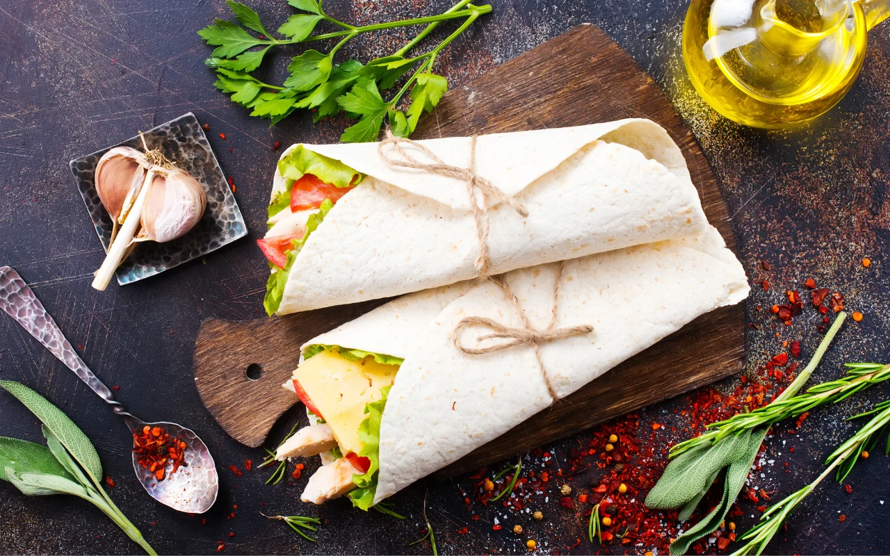 Tortilla z kurczakiem, serem cheddar, sałatą i czerwoną cebulką