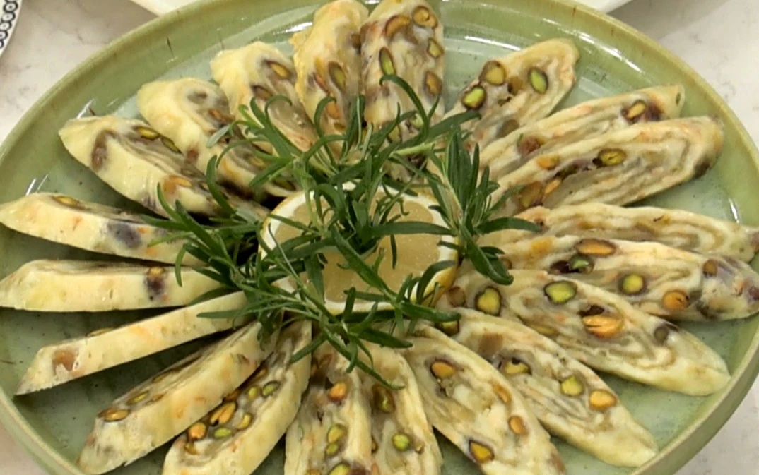 Wsuwamy całość do piekarnika i zapiekamy w 120°C, aż sery się rozpuszczą. Kiedy serowa baza jest gotowa, delikatnie wyjmujemy ją z pieca i zwijamy w szczelny rulon. Dociskamy, formujemy i odstawiamy do całkowitego wystudzenia - najlepiej na godzinę. Po tym czasie przychodzi moment na ostatnie szlify: całą roladę smarujemy miodem i obtaczamy ją w siekanych pistacjach, które tworzą chrupiącą otoczkę.