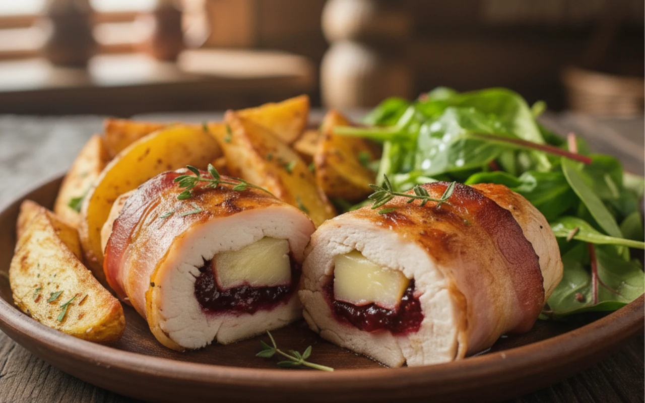 Filety z kurczaka podzielić na osiem części, lekko je rozbić i doprawić tymiankiem, solą, pieprzem oraz suszonym czosnkiem, po czym posmarować cienko konfiturą żurawinową i ułożyć na każdym kawałek oscypka; mięso zwinąć w roladki i owinąć plastrami boczku. Roladki przełożyć do naczynia żaroodpornego, delikatnie posmarować oliwą i piec w piekarniku nagrzanym do 180°C przez około 30 minut. W tym czasie obrać ziemniaki, pokroić je na ćwiartki, doprawić solą, papryką i suszonym czosnkiem, skropić oliwą i piec w 180°C około 30 minut, mieszając co jakiś czas. Upieczone roladki podawać z pieczonymi ziemniakami i prostą sałatą skropioną klasycznym winegretem przygotowanym z oliwy i soku z cytryny lub octu winnego.