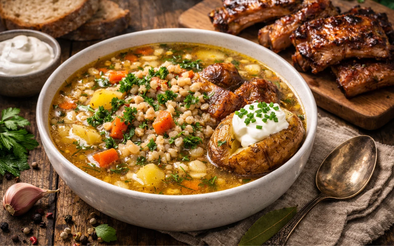 Zimą nic nie smakuje tak dobrze, jak miska gorącej, pożywnej zupy. Ten krupnik z żeberkami, pieczonymi ziemniakami i kwaśną śmietaną to propozycja idealna na rodzinny obiad lub weekendowe gotowanie na specjalną okazję. Aromatyczny, sycący i pełen warzyw, nie tylko rozgrzewa, ale też wspaniale pachnie kuchnią domową.