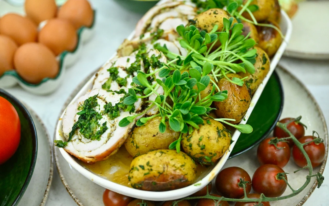 Obficie posmarować nią całą powierzchnię schabu (na warstwie żelatyny) i zwinąć ciasno w roladę, dociskając warstwy. Obsypac solą oraz pieprzem, a następnie zawinąć w papier do pieczenia i związać w równych odstępach. Piec pod przykryciem w 230°C, do uzyskania temperatury wewnętrznej 60°C (około 50 minut). Po upieczeniu roladę całkowicie wystudzić i schłodzić kilka godzin.