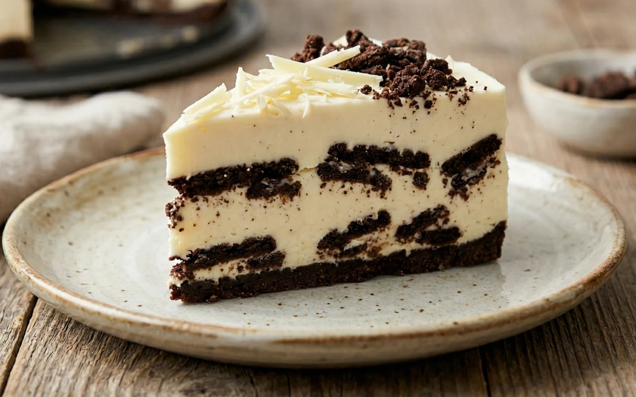 Sernik jogurtowy z białą czekoladą i ciastkami