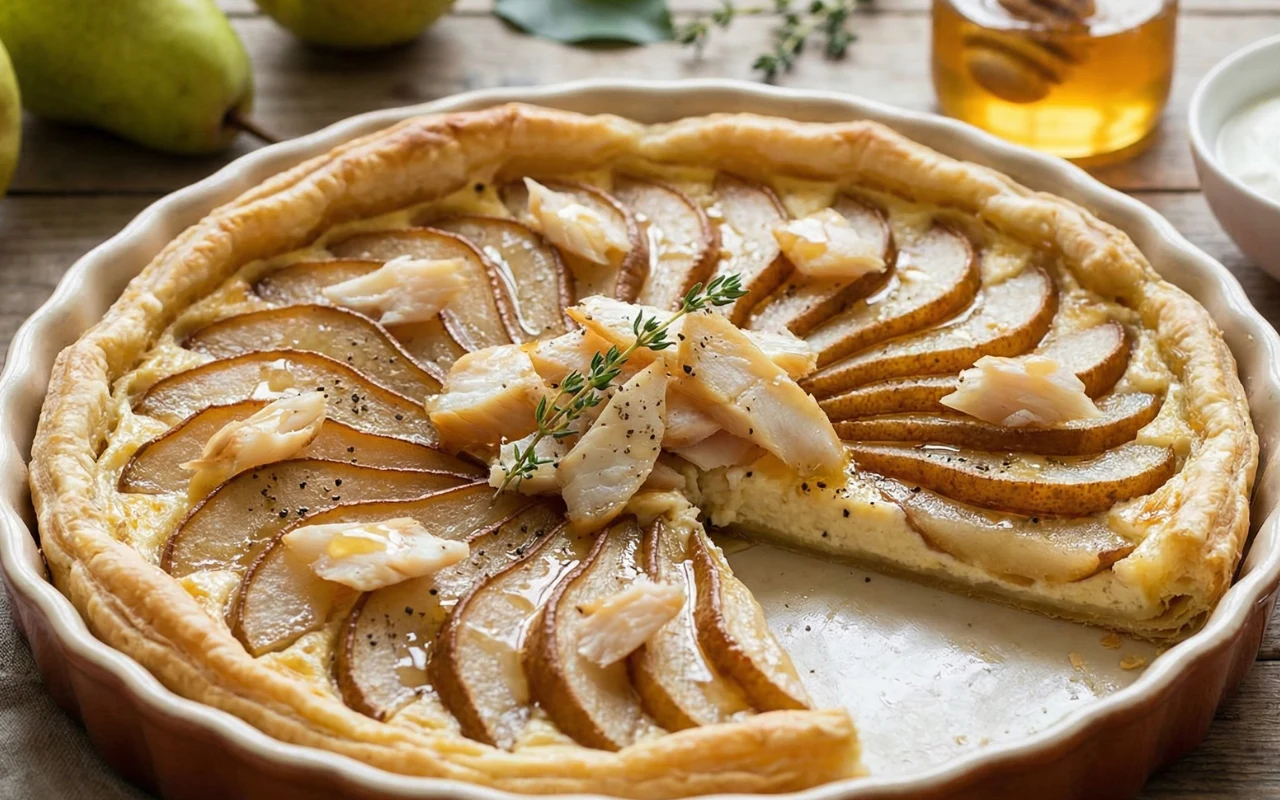 Tarta z gruszkami i wędzonym halibutem