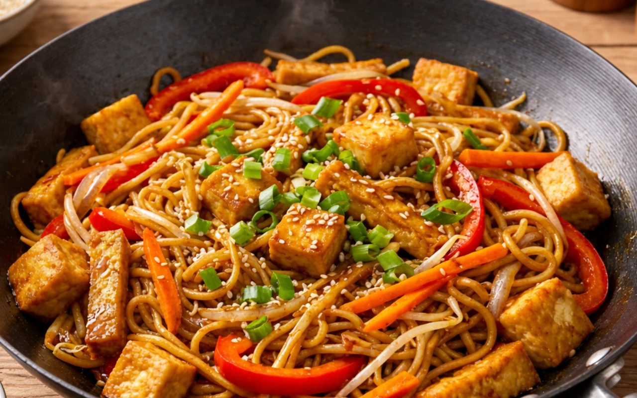 Smażony chow mein z chrupiącym tofu. Chiński klasyk w roślinnej odsłonie