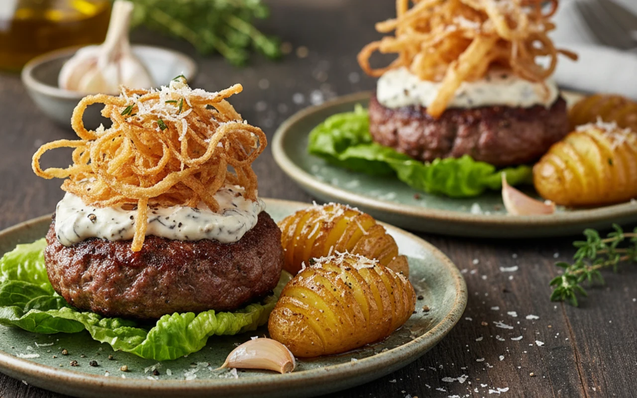 Ziemniaczki ponacinaj w stylu Hasselback, nie przecinając ich do końca, ułóż w naczyniu z tłuszczem, czosnkiem i tymiankiem, po czym konfituj na małym ogniu lub w piekarniku nagrzanym do 150°C przez 40-50 minut, aż będą miękkie i rumiane. W miseczce wymieszaj majonez z olejem truflowym, sokiem z cytryny i szczyptą soli. Ułóż burgery na liściach sałaty, dodaj majonez truflowy, chrust cebulowy i podawaj z konfitowanymi ziemniaczkami Hasselback. Posyp świeżo mielonym pieprzem i jeśli lubisz - startym parmezanem. Smacznego!