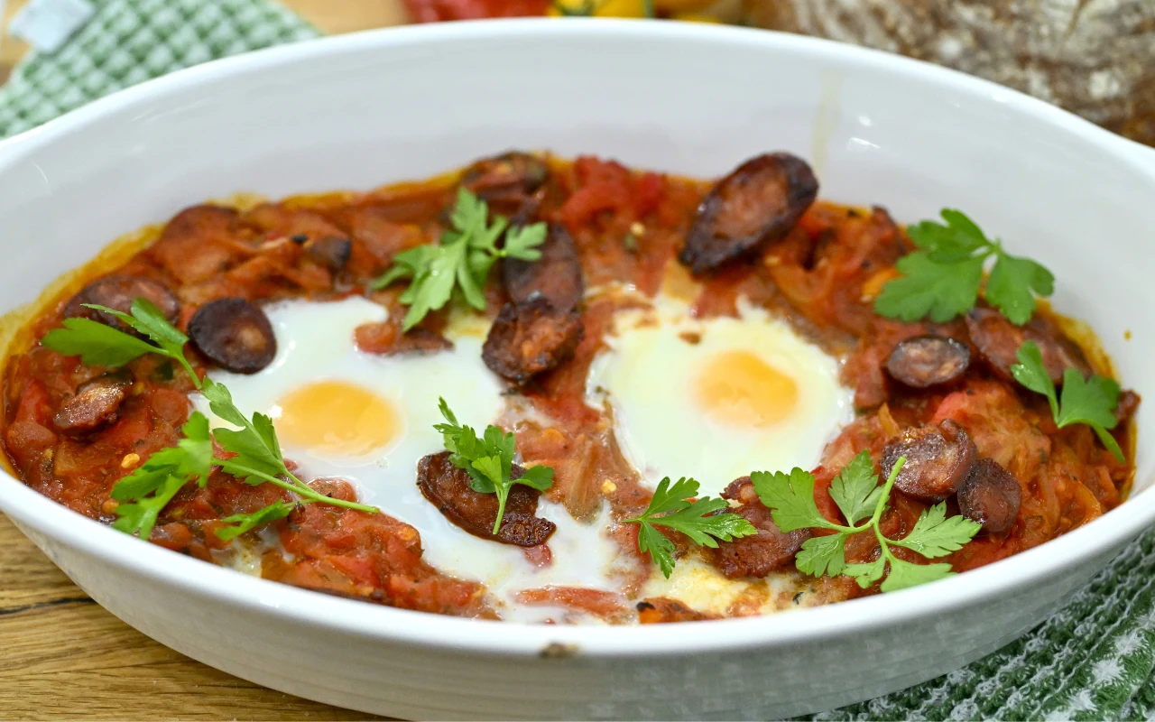 Szakszuka, wywodząca się z kuchni Maghrebu i spopularyzowana niemal na całym Bliskim Wschodzie, to esencja śniadaniowego comfort foodu, oparta na połączeniu pomidorów i jajek. W interpretacji Bogumiła Przybylaka baza zyskuje głębię dzięki technice wcześniejszego pieczenia papryki, co wydobywa z warzywa naturalną słodycz i dymny aromat. To danie niezwykle plastyczne - autor proponuje je więc w dwóch odsłonach. Wielbiciele i wielbicielki mięsnych smaków mogą wzbogacić całość o pikantne chorizo, podczas gdy w alternatywie roślinnej ich miejsce zajmują boczniaki, jajka zastępuje zaś tofu. Niezależnie od wersji całość spaja aromatyczny kumin, ostrość harissy i orzeźwiający finisz w postaci soku z cytryny.