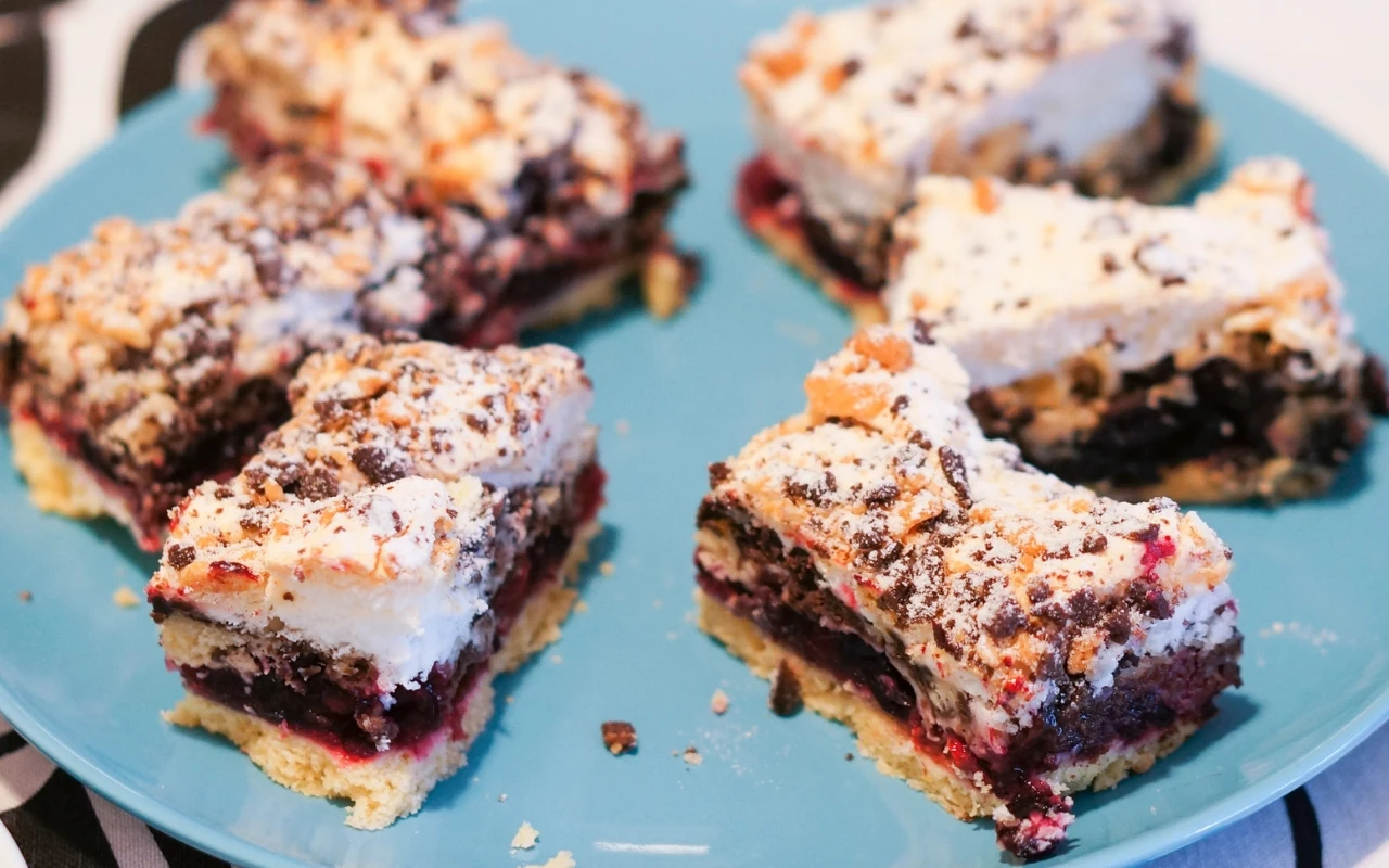 Pierwszą warstwę posmarować następnie dżemem i zetrzeć na to część kakaową, po czym wstawić do piekarnika na kolejne 10 minut. W międzyczasie ubić białka ze szczyptą soli na sztywną pianę, pod koniec dodając stopniowo pozostałą 1/2 szklanki cukru. Gotową pianę wyłożyć na podpieczone warstwy, na nią zetrzeć zaś drugą część jasnego ciasta. Piec kolejne 25 minut w 180°C. Studzić powoli, najlepiej przy uchylonych drzwiczkach piekarnika. Kroić po całkowitym wystudzeniu.