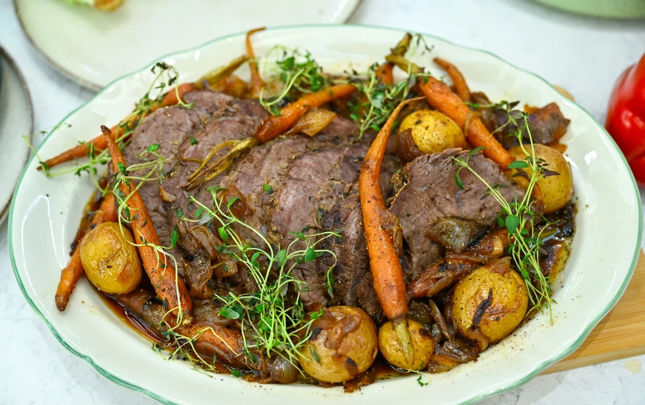 Sztufada to jedno z tych dań, które definiują niejako historyczną kuchnię polską, choć jej nazwa wywodzi się bezpośrednio z włoskiego "stufato" (oznaczającego "duszone mięso"). Jurek Sobieniak przypomina tu technikę, która w dobie pośpiechu została niesłusznie zapomniana - szpikowanie. To zabieg niezbędny, by chudy z natury kawałek wołowiny - krzyżowa - nie wyschła podczas wielogodzinnej obróbki termicznej, a miast tego nabrała maślanej kruchości. Wciśnięte w głąb mięśni paski słoniny działają jak wewnętrzny system nawilżania, wytapiając się powoli i aromatyzując mięso od środka. W połączeniu z długim czasem pieczenia w niskiej temperaturze, daje to efekt mięsa, które niemal rozpada się pod naporem widelca.
