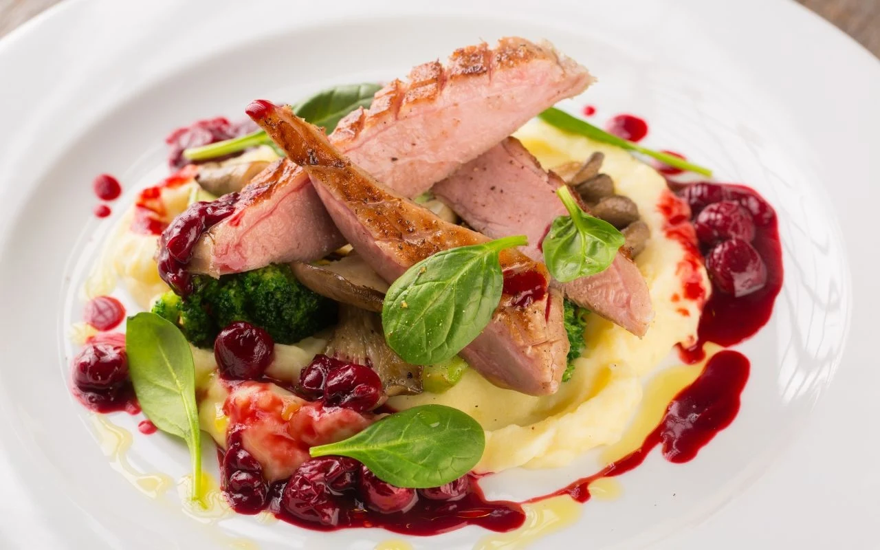 Piersi z kaczki w sosie miodowo-żurawinowym z pietruszkowym puree
