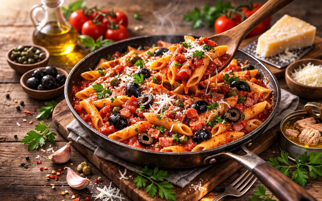 Bazą tej wersji makaronu jest wytopiony boczek, oliwa z oliwek oraz trio smaków: kapary, czarne oliwki i pomidory. Sos jest gęsty, aromatyczny i lekko słony. Krótkie redukowanie sprawia, że smaki się koncentrują, a całość nabiera głębi.