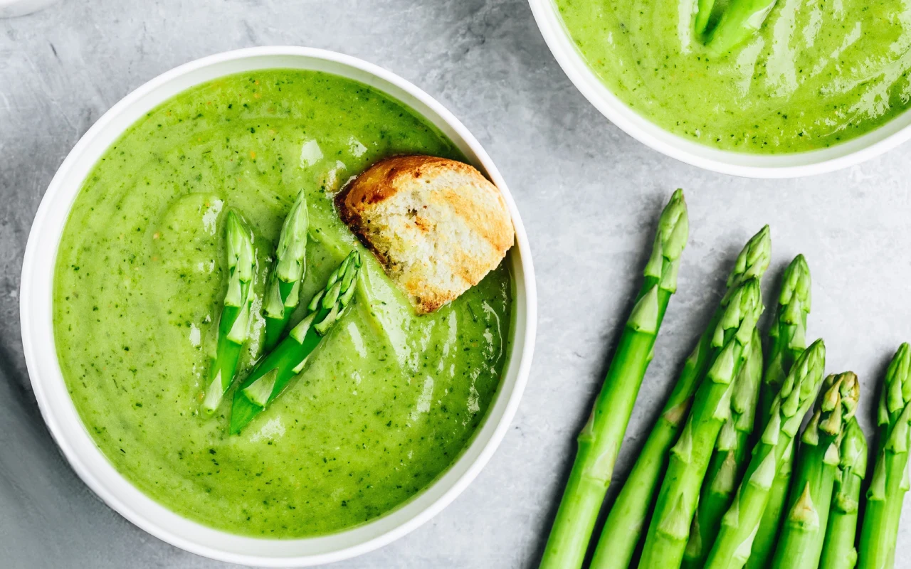 Krem podawaj z grzankami i główkami szparagów, posypany pokruszoną fetą.