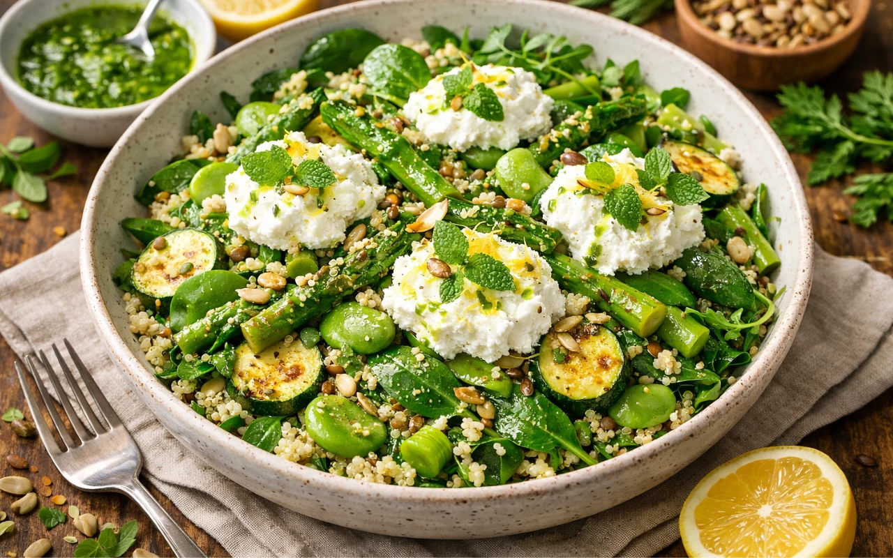 Soczyste warzywa - młody szpinak, rukola, musztardowiec, zielone szparagi, mini cukinia i bób tworzą świeżą, lekką bazę sałatki. Każdy składnik zachowuje naturalną teksturę i kolor, a delikatne podsmażenie szparagów i cukinii podkreśla ich aromat. Dodatek quinoa sprawia, że danie staje się treściwe, a zarazem zdrowe i sycące.