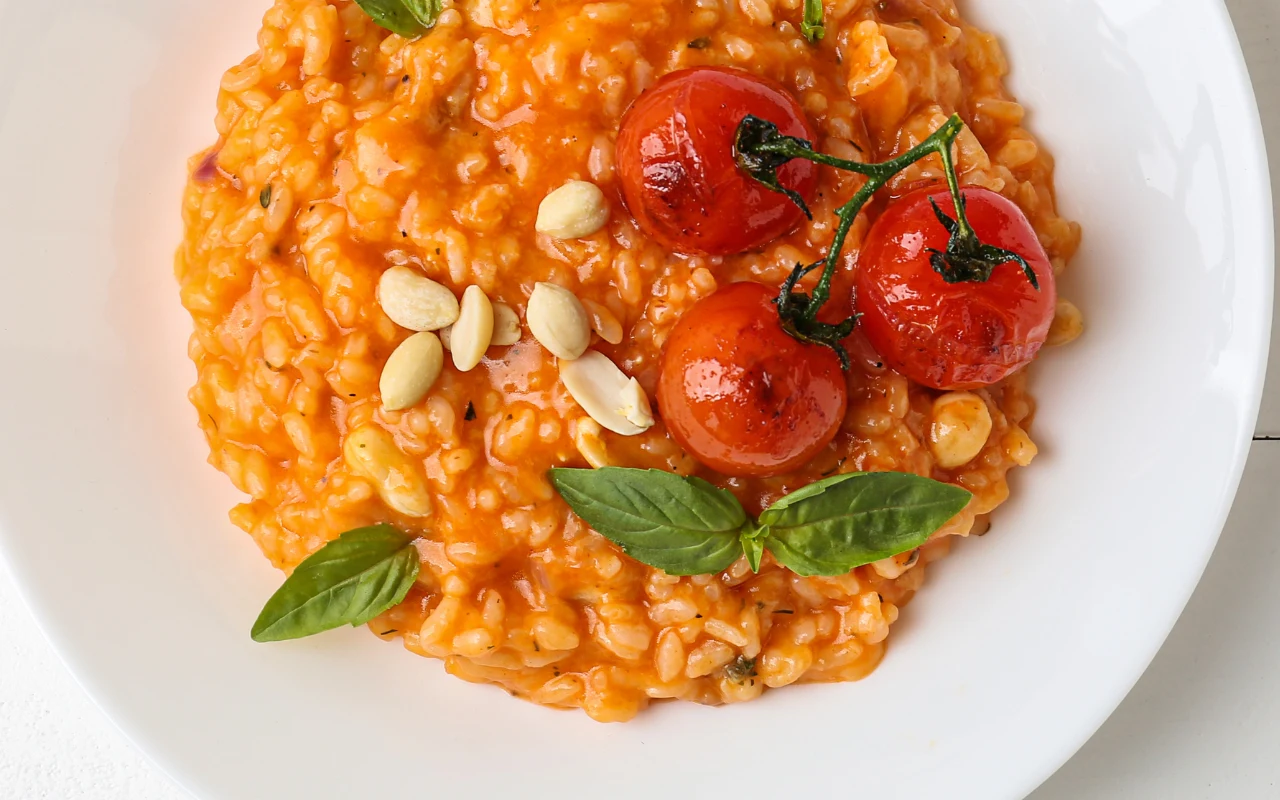 To już nie risotto z lombardzkiej trattorii, ale autorska interpretacja w duchu kuchni śródziemnomorskiej - takiej, która pozwala pomidorowi zagrać pierwsze skrzypce, a francuskiemu bleu i włoskim orzechom stworzyć dla niego pełne kontrastów tło.