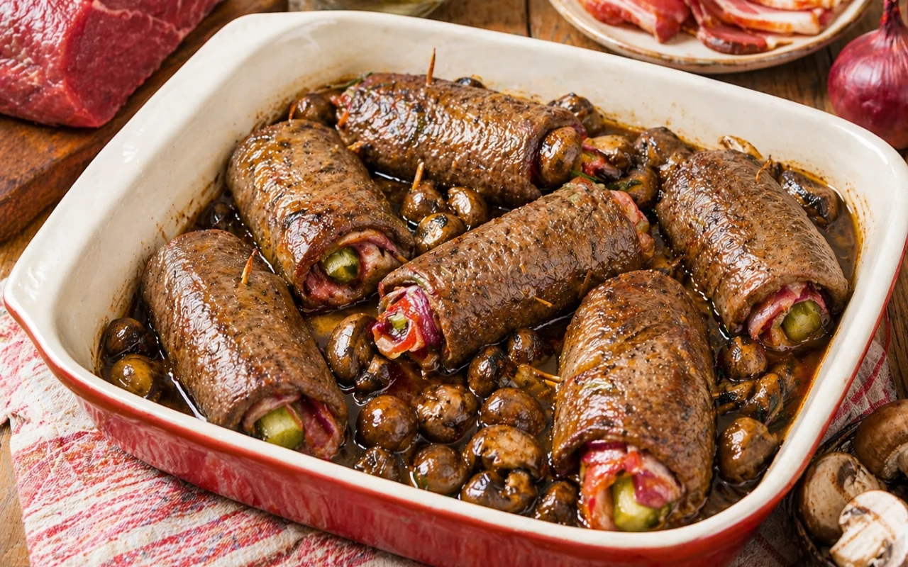 Roztbef wołowy rozklep na 2 mm. Zalej sosem sojowym, zamarynuj. Każdy kotlet posyp pieprzem, ułóż ogórek, plaster boczku, cebulę. Zawiń jak krokiet, zabezpiecz wykałaczką. Obsmaż na rumiano. W brytfannie ułóż pieczarki, na to zrazy, zalej winem. Przykryj pergaminem i folią. Piecz w 250°C przez 12 minut.