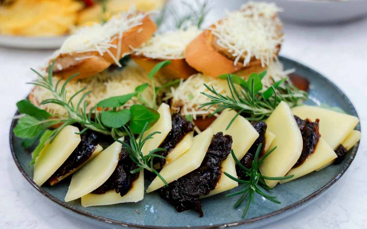 Bruschetta – klasyczna włoska przystawka, na ogół kojarząca się z oliwą i pomidorami, w tej wersji została nieco osłodzona. Pokrywa ją bowiem daktylowe masło (będące oryginalnym nawiązaniem do bliskowschodnich smaków), które w ciekawy sposób łączy się z tartym džiugasem. Innymi słowy – kuchnia fusion pełną... buzią.
