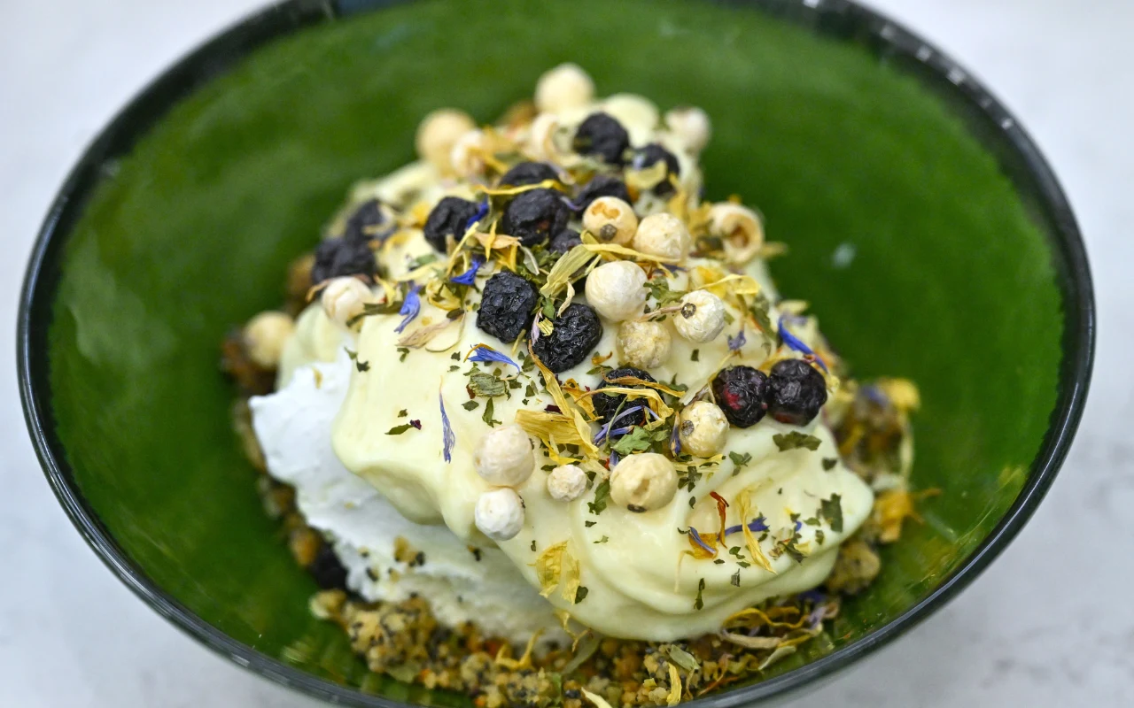 Do miseczek przełożyć śliwki razem z sokiem z pieczenia, dodać gałkę lodów śmietankowych, wycisnąć pianę zabaione z syfonu i zasypać kruszonką, opcjonalnie udekorować suszonymi jadalnymi kwiatami i liofilizowanymi owocami.