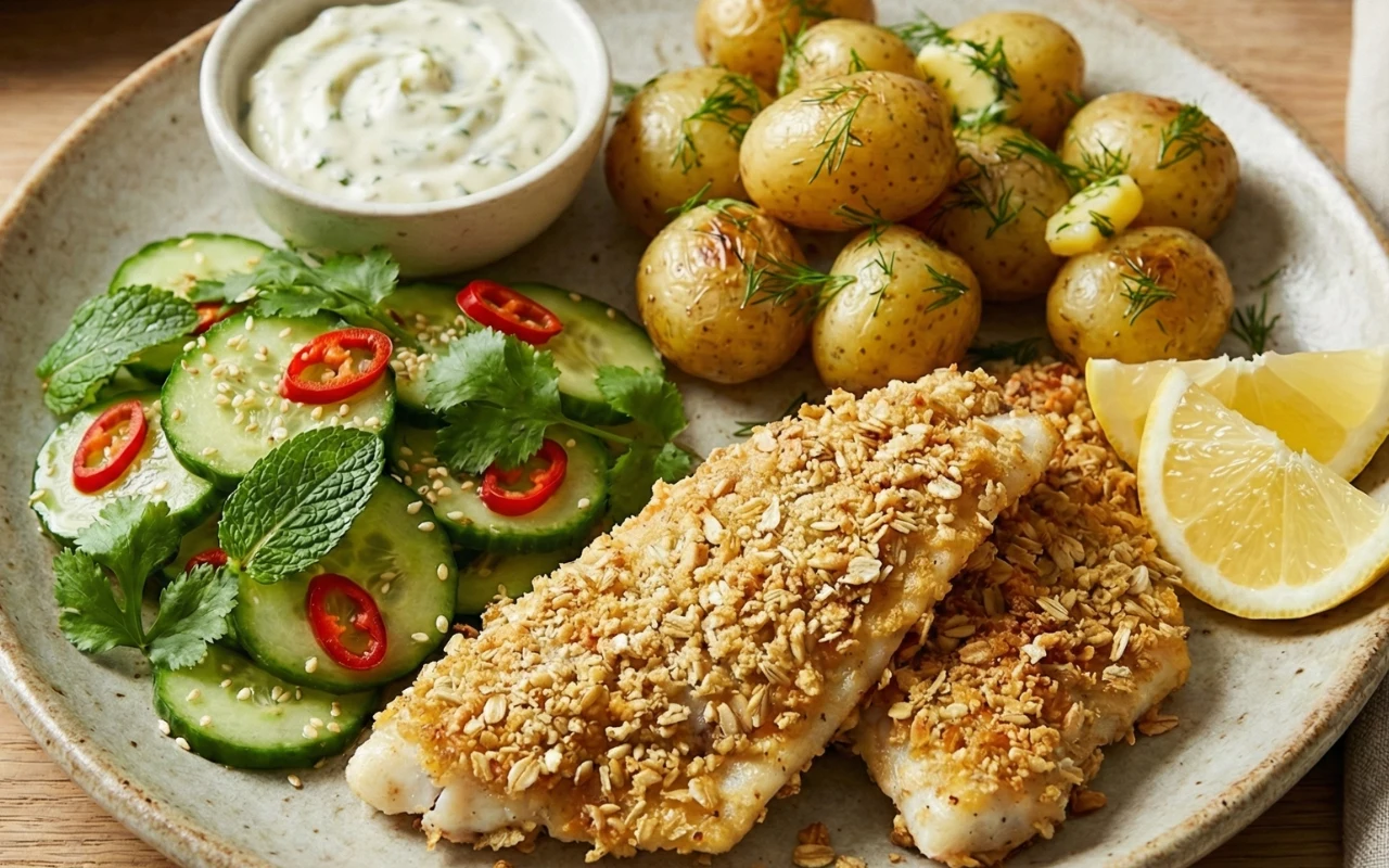 Panierowany okoń z ogórkową sałatką i ziołowym majonezem