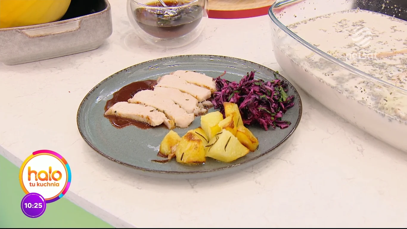 Schab pieczony z kością, w sosie ze śliwek, w towarzystwie francuskich ziemniaków w mundurkach i nowoczesnej wersji surówki z czerwonej kapusty jest już gotowy i kusi w studio “halo tu polsat” swoim aromatem. A Mateusz prosi o sugestie, co widzowie chcieliby, żeby ugotował.