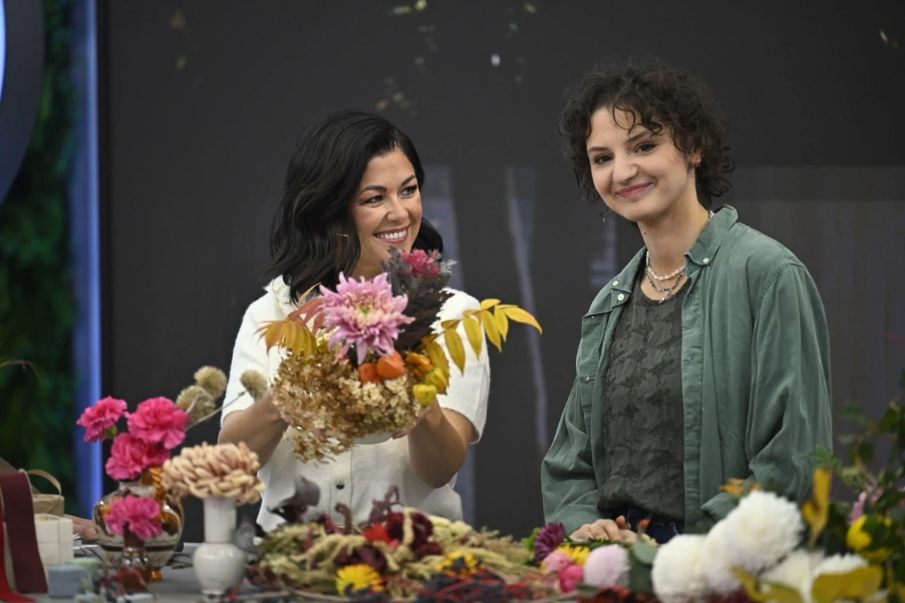 Kwiaciarka wspólnie z Kasią stworzyły kompozycję z użyciem wysuszone hortensji, która zamaskowała siatkę i była bazą dla pozostałych roślin. Kompozycję tworzyła również pomarańczowa miechunka, złote liście oraz duży, ozdobny zasuszony kwiat.