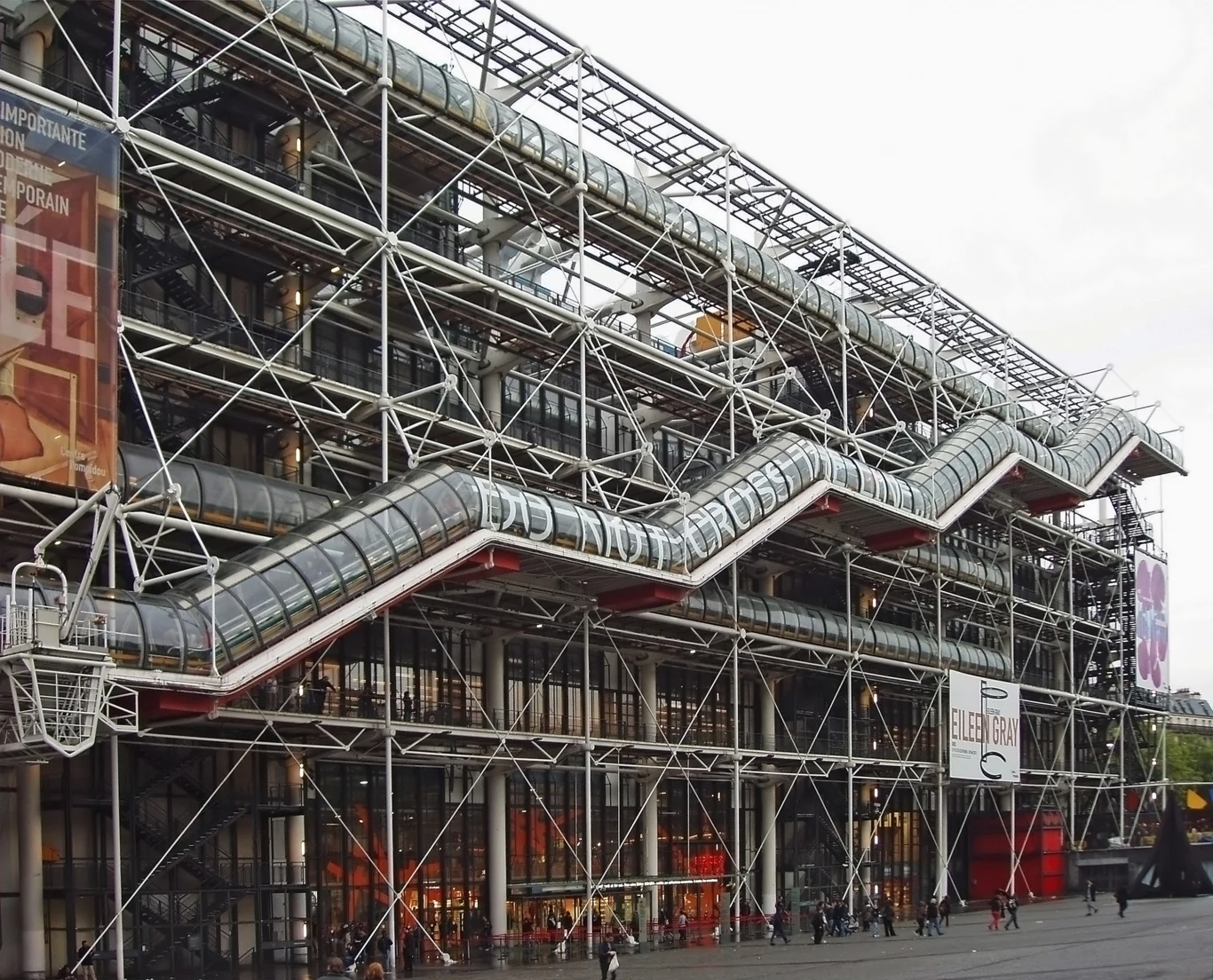 Fasada budynku to w istocie gigantyczny diagram instalacyjny, w którym każdy element ma swoje znaczenie, opisane precyzyjnym kodem kolorystycznym. Błękit symbolizuje powietrze - a przez to klimatyzację, zieleń - obieg wody, żółć skrywa instalacje elektryczne, a czerwień odpowiadać ma komunikacji (stąd tunel schodów ruchomych na elewacji, w całości utrzymany w tym właśnie kolorze). Całość spina potężna, stalowa konstrukcja z charakterystycznymi wspornikami, znanymi jako gerberettes. To inżynieryjna szczerość posunięta do granic możliwości - budynek nie ukrywa, jak działa, prezentując swoją "anatomię".
